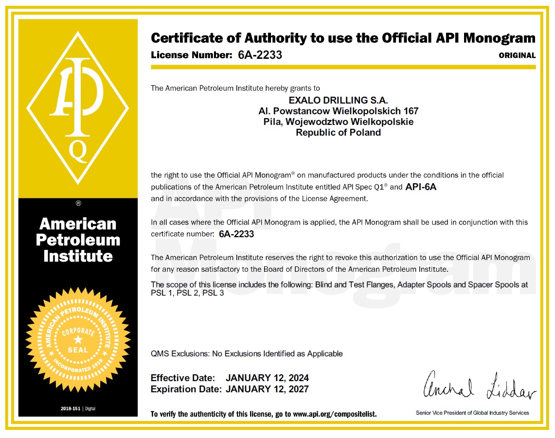 Certificate API 6A-2233 | Certificate API 6A-2233 (Certificate of Authority to use the official API Monogram) |