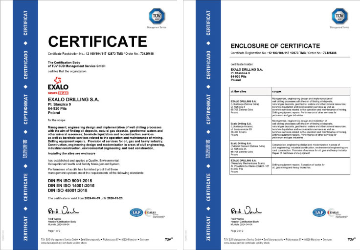 The Integrated Quality, Environment and Occupational Health and Safety Management System at Exalo Drilling S.A. covers all company processes, including drilling works, maintenance works, workshop processes and construction processes. This means we offer services of the highest quality, while maintaining the highest standards for workplace health and safety and implementing solutions to reduce our environmental impact.